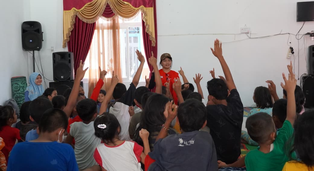 Sekitar 50 anak, dari balita hingga remaja, berkumpul di sebuah gedung yang disiapkan dekat area pengungsian. Di ruang aman itu, mereka mengikuti kegiatan bermain, belajar, dan berkreasi dengan alat yang disediakan.