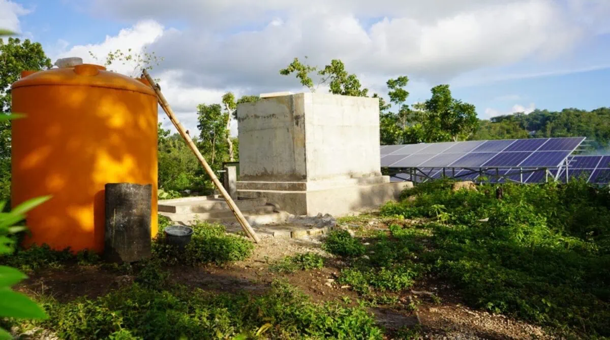Bak penampungan air dan panel surya. Ini merupakan bagian dari instalasi air bersih yang dialirkan ke semua titik kran air di desa. Panel surya ini mengumpulkan energi listrik yang digunakan untuk menyalakan pompa air.
