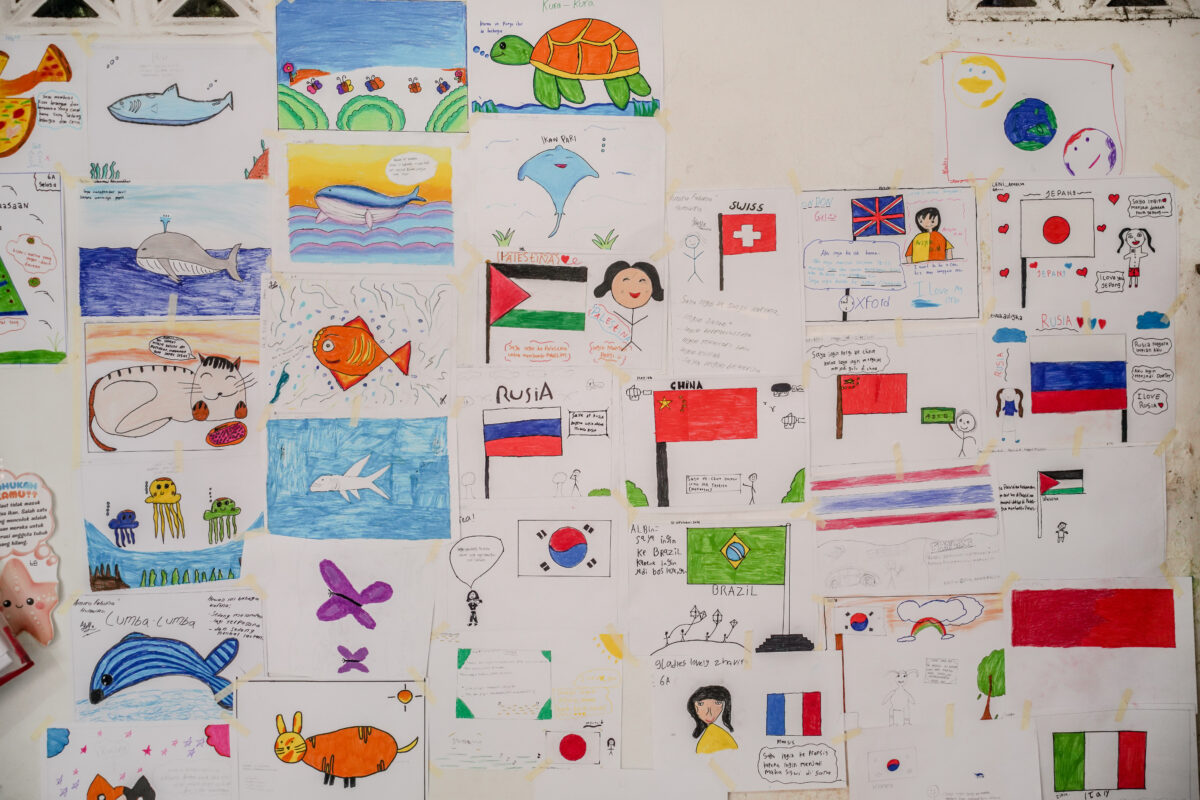 Sementara itu, Rizki*, teman sekelasnya, menggunakan seni untuk mengungkapkan kerinduan. “Saya menggambar ini karena saya kangen dengan dua teman saya yang sudah pindah rumahnya,” ungkap Rizki.