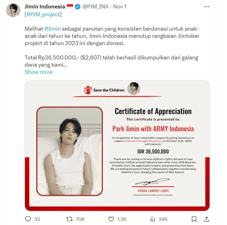 Seperti idolanya, komunitas Jimin Indonesia juga rindu untuk berkontribusi bagi anak-anak di sekitarnya. Melalui Save the Children, komunitas Jimin Indonesia memberikan bantuan untuk meringankan dampak kekeringan pada kesehatan anak-anak.